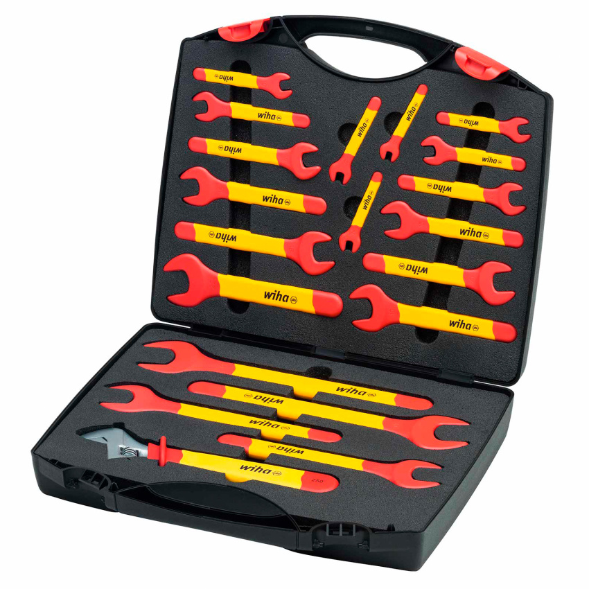 Při práci na dílech pod napětím je na prvním místě bezpečnost uživatele. Sadou nástrojů včetně jednostranného otevřeného klíče a stavitelného klíče jsou elektromechanici a kvalifikovaní elektrikáři výborně vybaveni pro práce na elektrických zařízeních. Nastavením rozevření 15° jsou izolované jednostranné otevřené klíče ideální pro instalaci svorek a hrdel na úzkých místech. Také přiložený stavitelný klíč lze variabilně nastavit a má maximální otvor klíče 30 mm. Poškození citlivých povrchů jsou minimalizována zvlášť hladkými a paralelně probíhajícími čelistmi. Nástroje obsažené v sadě jsou podrobeny kusové zkoušce podle mezinárodní normy IEC 60900 a umožňují bezpečnou práci v oblasti dílů pod napětím do 1 000 V AC.