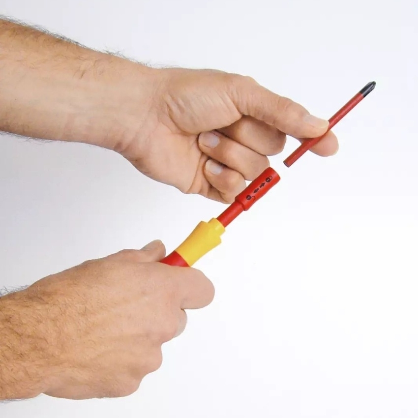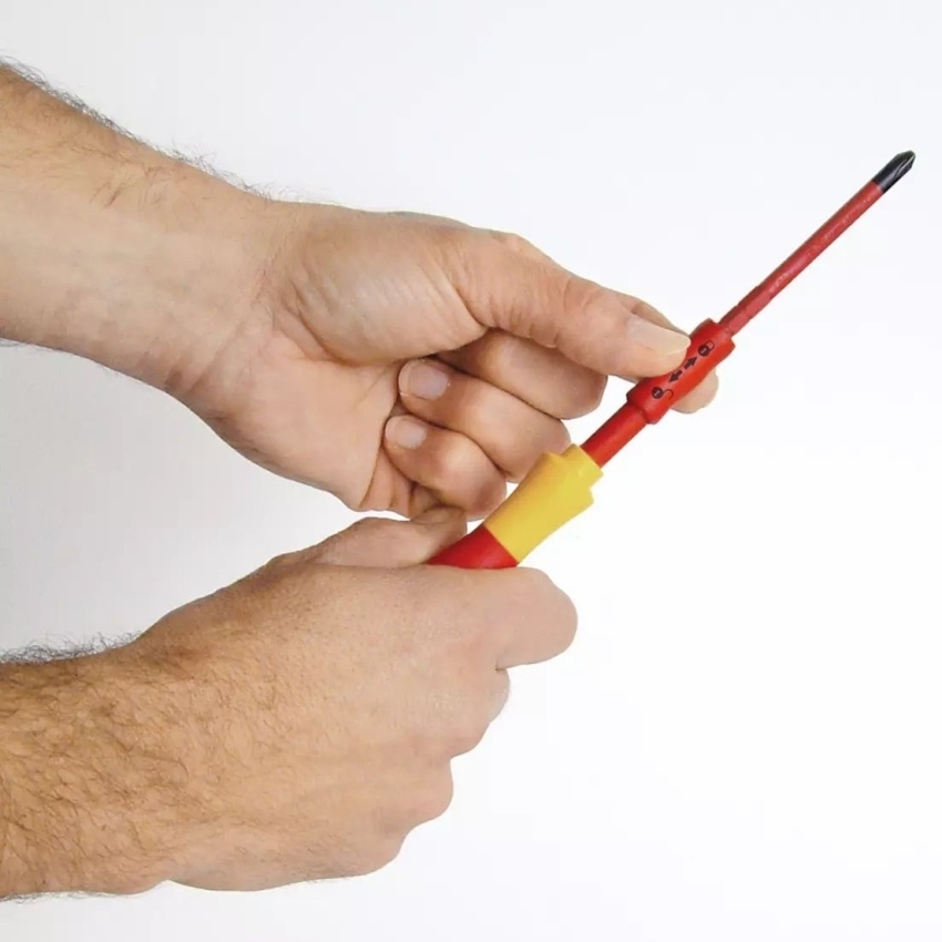 - Každý nástroj v sadě byl podroben kusové kontrole podle mezinárodní normy IEC 60900 a umožňuje bezpečnou práci v oblasti dílů pod napětím až do 1000 V AC.