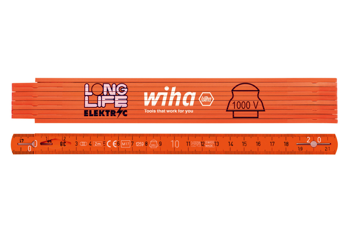 Pro instalaci do krabice pod omítku a protažení kabelů potřebuje elektromechanik několik ručních nástrojů s různými funkcemi, aby mohl svou práci vyřídit rychle a efektivně. Díky univerzálně použitelnému skládacímu metru Longlife pro elektromechaniky může být zároveň vykonáno několik pracovních kroků najednou. Tyčový metr přesvědčí integrovanou přídržnou funkcí pro kabely v rozmezí 3 až 7 mm, která usnadní vedení kabelu na těžko přístupném instalačním místě. Další výhodu při elektroinstalaci nabízí krabicová stupnice až pro 3 krabice pod omítku a značení vzdálenosti okraje při 150 mm. Díky oranžové barvě je možné tyčový metr na staveništi rychle a jednoduše najít, takže nedochází k časové ztrátě kvůli hledání ztracených nástrojů nebo kvůli jejich nahrazení. Dále je možné jej díky kapesní svítilně s UV světlem Wiha rychle najít i u špatných světelných poměrů. Tyčový metr tuhý v ohybu navíc přesvědčí maximální trvanlivostí a absolutní přesností.