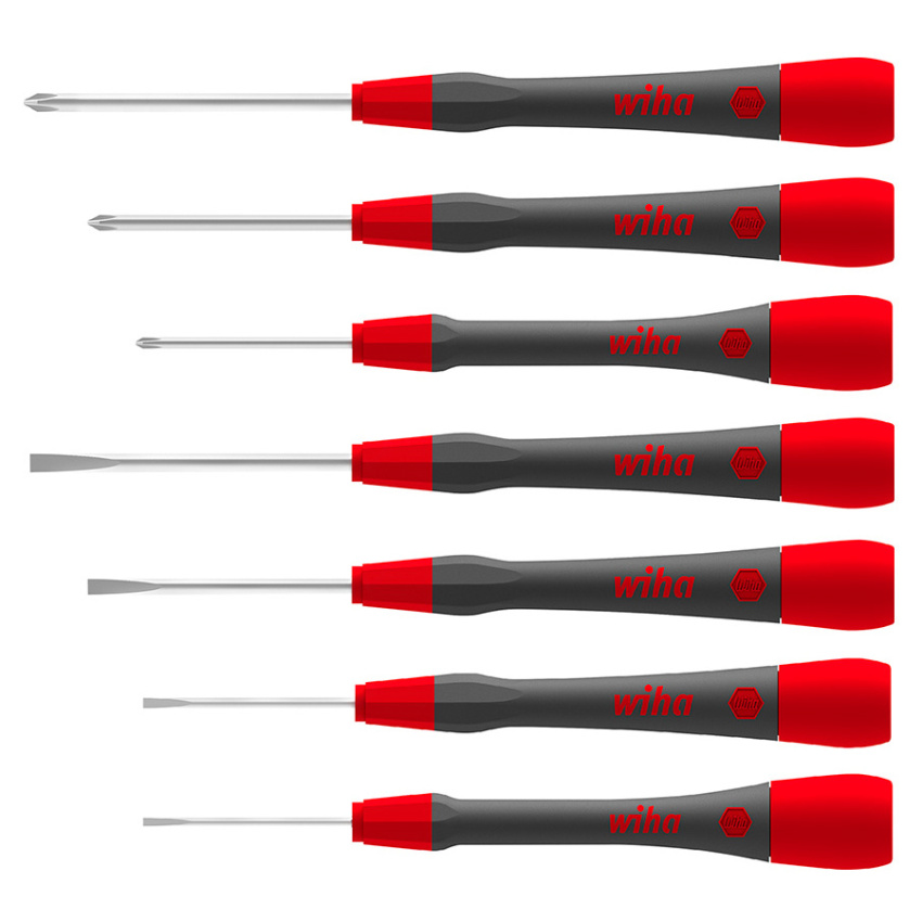 Nároky u jemných mechanických šroubení spočívají v přesné a citlivé práci bez poškození obrobku. Jemné šroubováky PicoFinish společnosti Wiha jsou díky svým dlouhým, štíhlým rukojetím a částí pro rychlé otáčení ideální pro jemnou a přesnou práci v jemné mechanice, rovněž i v oblasti kutilství a modelářství. Ergonomický design rukojeti s měkkou částí umožňuje komfortní práci. Citlivé a rychlé otáčení je podpořeno otočnou krytkou s lehkým chodem. Symboly natištěné na otočné krytce šroubováku usnadní výběr správného profilu šroubováku. V sadě je obsaženo 7 jemných šroubováků PicoFinish.