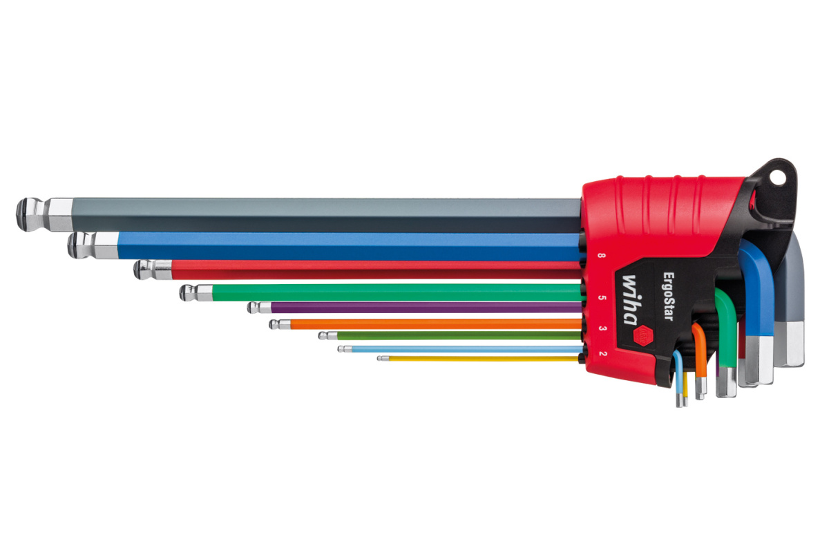 Kdo to nezná? U mnoha držáků zástrčných klíčů je třeba zdlouhavě vyjímat jednotlivé klíče nebo je zase zavádět zpět do držáku. Ale s tím je už nyní díky Wiha ErgoStar konec, neboť tento systém geniálním způsobem vyřešil tento problém. Otáčení samostatného zástrčného klíče v držáku vede k tomu, že se všechny ostatní klíče otáčejí ve stejném úhlu ke straně, a tím je umožněno rychlé a pohodlné vyjímání. Sevření v držácích zajistí, že klíče nemohou vypadnout jak u uzavřeného, tak i otevřeného držáku. Navíc lze barevné zástrčné klíče rychle a jednoduše najít a díky svíticímu laku je dobře najdete i ve tmě za pomoci UV světla. Zkrátí se tím doba hledání ztraceného zástrčného klíče a při údržbě zařízení se sníží nebezpečí zapomenutí nástrojů ve stroji. Díky přídržné funkci MagicRing s pružným ocelovým kroužkem zástrčné klíče perfektně udržují v jakékoli poloze všechny šestihranné normované šrouby bez magnetu. Šestihranná kulová hlava umožňuje snadné šroubování pod úhlem až 25°. Sada zástrčných klíčů obsahuje devět barevných šestihranných zástrčných klíčů v běžných velikostech.