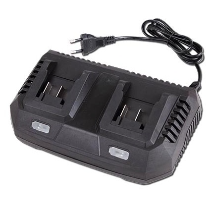 Nabíječka je určena pro nabíjení Li-ion 2.0, 4.0, 5.0 Ah akumulátorů. Výhoda nabíječky je možnost nabíjení 2x akumulátorů současně. Maximální doba nabíjení 2x4Ah článků do 1 hodiny. TECHNICKÉ PARAMETRY: Napětí: 230V/50Hz Výstupní napětí: 21,5 V Výstupní proud: 3,5 A Třída ochrany: II LED indikace stavu baterie Hmotnost: 0,6 kg