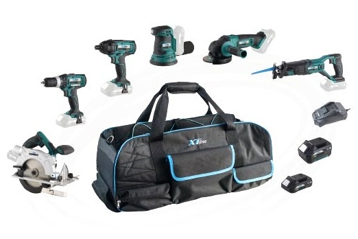 Sada aku nářadí XTline obsahuje aku vrtačku, aku rázový utahovák na bity, aku úhlovou brusku 115m, aku vibrační brusku, aku kotoučovou pilu, 2x baterii 18V 2.0Ah, 1x baterii 18V 4.0Ah a nabíječku baterií.