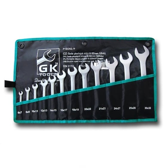 Sada plochých maticových klíčů v textilním obalu. Norma DIN 3110, materiál 31CrV3. <br><br><strong>Sada obsahuje tyto velikost:</strong> 6x7, 8x9, 10x11, 12x13, 14x15, 16x17, 18x19, 20x22, 21x23, 24x27, 25x28, 30x32 mm.