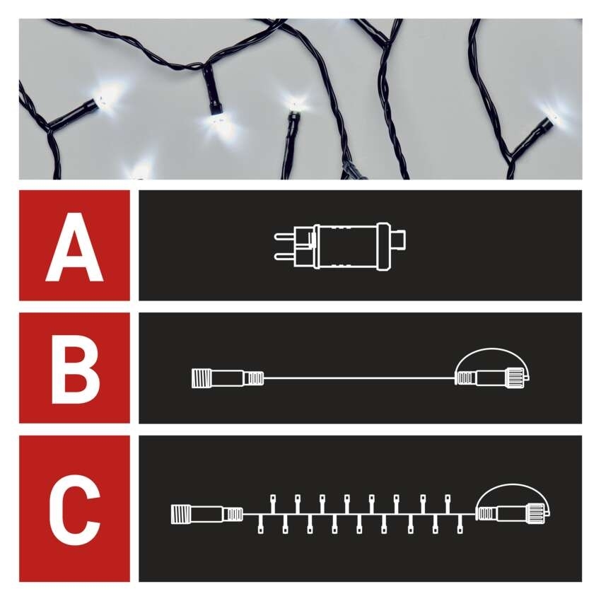 - Začněte zdrojem (A), připojte k němu prodlužovací kabel (B), vánoční řetěz (C) a pusťte se do zdobení trámů, balkónů, venkovních altánů, přístřešků, plotů a okapů. Základní sadu můžete postupně rozšiřovat o další komponenty systému, vzájemně je propojovat a kombinovat.