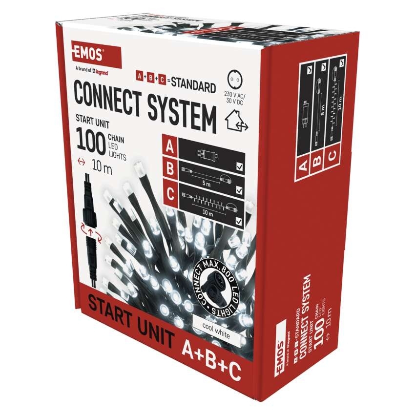 - Základní sada systému CONNECT STANDARD obsahuje vše potřebné k tomu, abyste mohli ihned začít s výzdobou vašeho domu, zahrady nebo interiéru. V jednom balení naleznete tři základní komponenty systému nutné pro jeho provoz – napájecí zdroj s časovačem (A), prodlužovací kabel o délce 5 m (B) a vánoční řetěz o délce 10 metrů se 100 LED diodami (C).