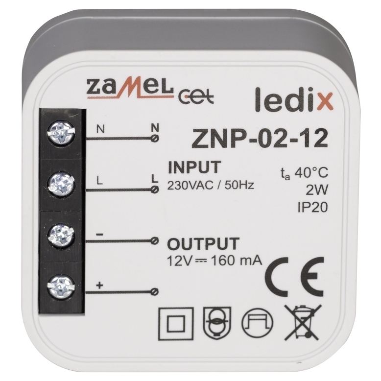- Napájení ZNP-02-12 je profesionální impulsní napájení s výstupním napětím 12 V DC se jmenovitým výkonem 2W. Napájení je určeno ke spolupráci s výrobky LEDIX (svítidla, ovládače, rádiové přijímače) a jinými LED výrobky napájenými napětím 12 V DC.