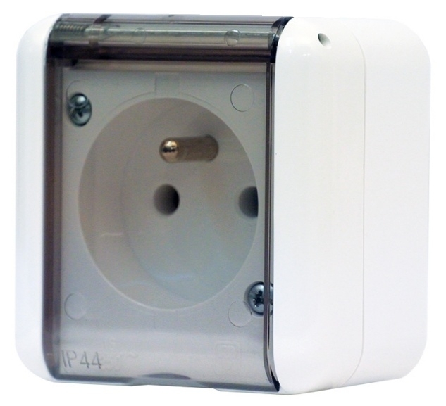 Jednoduchá zásuvka na povrch s průhledným víčkem. Šroubové svorky.