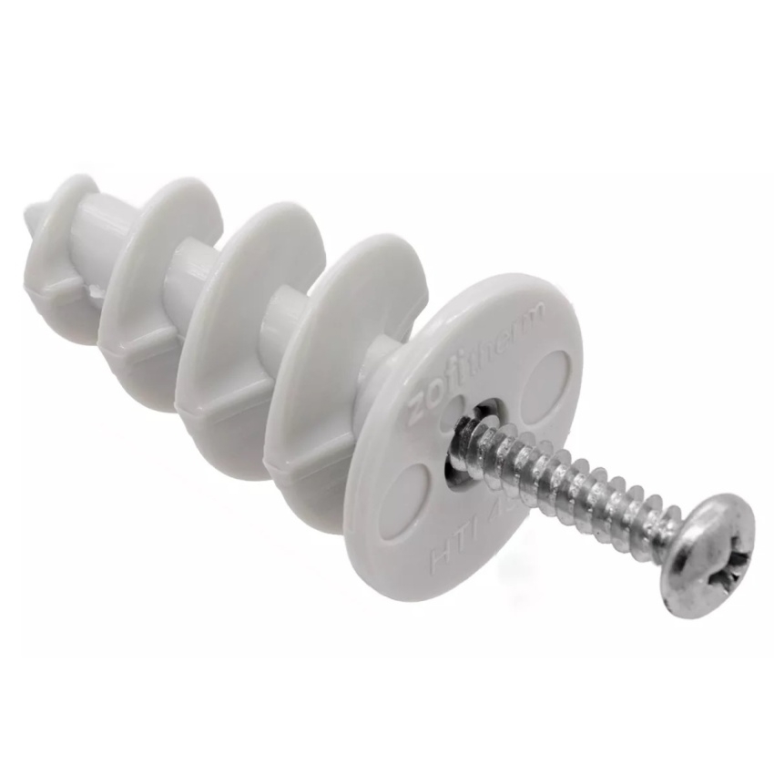 ZOFITHERM HTI45 je kotvící hmoždinka do fasádních tepelných izolací určená pro kotvení drobných a lehkých předmětů na plochu kontaktní zateplené fasády. Eliminuje nežádoucí tepelný most a zajišťuje pevný spoj mezi kotveným předmětem a fasádním tepelným izolantem. Vhodná pro kotvení do EPS, XPS, PUR, PIR, MW s podélným vláknem a EPS soklových desek s výztužnou armovací vrstvou a finální omítkou. Montáž se provádí do předvrtaného otvoru průměru 8 mm. Vrut není součástí balení.